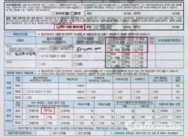 그러나 A씨는 “자필서명을 한 것은 맞지만 부지점장이 형광펜으로 표시한 부분에 서명한 것이기 때문에 어떤 내용에 대한 것인지 모른다. 운용보고서, 잔고통보서, 사후관리서비스에도 거절 칸에 체크가 돼있는데 상식적으로 큰돈을 맡기면서 관련 서비스 받기를 거절할 이유가 없다”며 “받은 서류도 펀드통장과 온라인 가입 안내서가 전부고 투자설명서는 받지 못했다”고 반박했다.