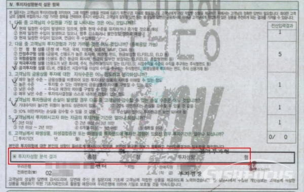 이어 “최근에야 가입 당시 서류들의 스캔본을 받았는데 A씨의 필체가 아닌 것으로 보이는 표시가 발견됐다”며 “안전한 투자를 원했던 A씨의 투자성향이 왜 공격투자형으로 돼있는지 이해할 수 없고, 정황상 대필했을 가능성이 높아 보이는데 이는 심각한 불완전 판매”라고 주장했다.