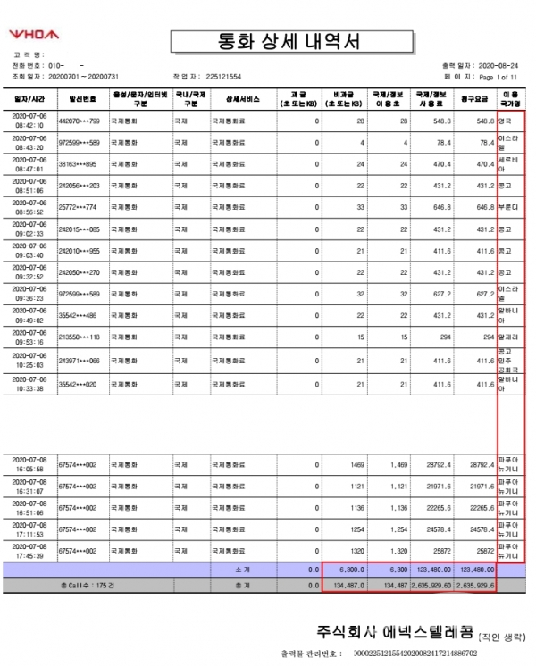 A씨의 통화 상세 내역서를 살펴보니 7월 6일부터 8일까지 사흘 동안 부룬디, 짐바브웨, 차드 등 총 16개국에 175건의 발신 기록이 잡혀있었고, 통화 시간을 모두 더해보니 37시간이 넘었다. 이렇게 많은 나라의 누군가와 통화를 한 것은 물론 사흘 동안 37시간이나 통화를 한 것은 정상적인 패턴이라고 보기는 어려웠다.