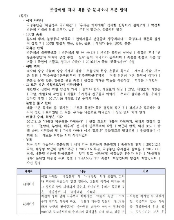 그 책이 바로 2017년 간행된 「촛불혁명」이다. 이 책은 과도하게 촛불시위를 ‘혁명’으로 치켜 세우며, 헌법적 질서에 따라 국회와 헌법재판소에서 탄핵이 이루어진 사건을, 법을 넘어서는 ‘혁명’으로 규정하고 호도하는 내용을 담고 있다.