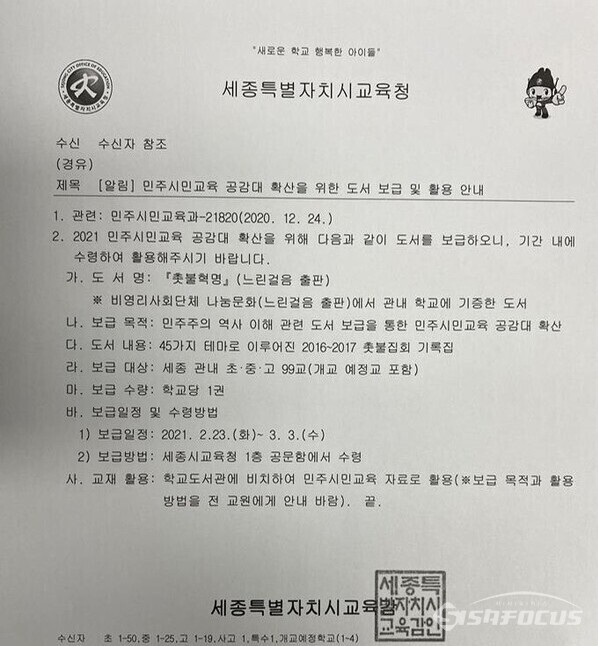 세종특별자치시 교육감 최교진은 최근 공문을 통해, 자신들의 숨은 의도를 드러냈다. 공문의 제목은 “민주시민교육 공감대 확산을 위한 도서 보급 및 활용 안내”이다. 이 공문에서 하나의 책을 보급하겠다고 하며, 민주시민교육의 자료로 사용할 것을 주문하고 있다.