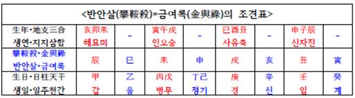 그 내용을 정리해 요약해 보면 다음과 같은 반안살(攀鞍殺)·금여록(金與祿)의 조견표 만들어질 수 있음이다.