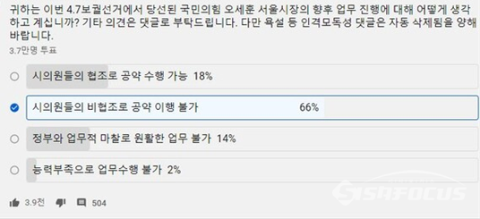 4월 9일, 시사포커스가 여론조사를 시행했다. 이 중 오세훈 서울시장의 향후 업무 성공 전망에 관한 질문이 주목을 받고 있다.