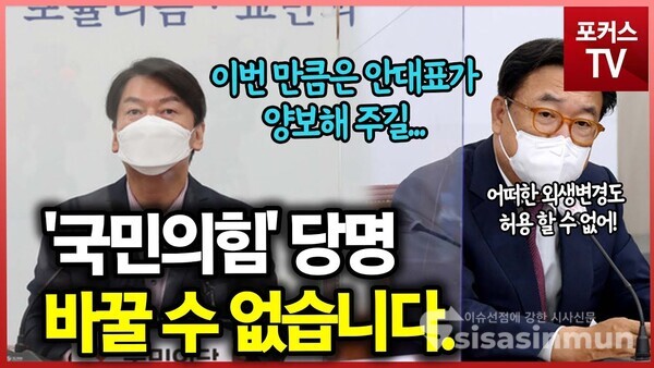 [시사신문 / 임희경 기자] 국민의힘 정진석 의원이 페이스북에 "'국민의힘' 당명은 바꿀 수 없다"며 "이번 만큼은 안대표가 양보해 주기 바란다"고 말했다.