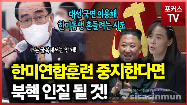 [시사신문 / 임희경 기자] 국민의힘 태영호 의원이 페이스북에 "김정은남매의 협박에 굴복하여 한미연합훈련 중지한다면 당면한 남북관계에서 주도권 잃는 것은 물론 영원히 북핵 이고 사는 북핵 인질 될 것이다"라고 말했다.