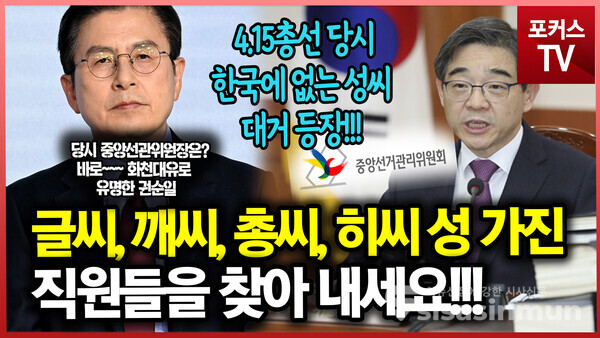 [시사신문 / 임희경 기자] 국민의힘 황교안 전 대표가 페이스북에 "중앙선관위는 글씨, 깨씨, 총씨, 히씨 성을 가진 직원들을 찾아 내라"며 "2020 4.15총선 당시 사전선거 우편투표 접수 업무에 종사했던 선관위 직원들 가운데는 한국에는 전혀 없는 희한한 성씨를 가진 분들이 대거 등장했다"고 말했다.