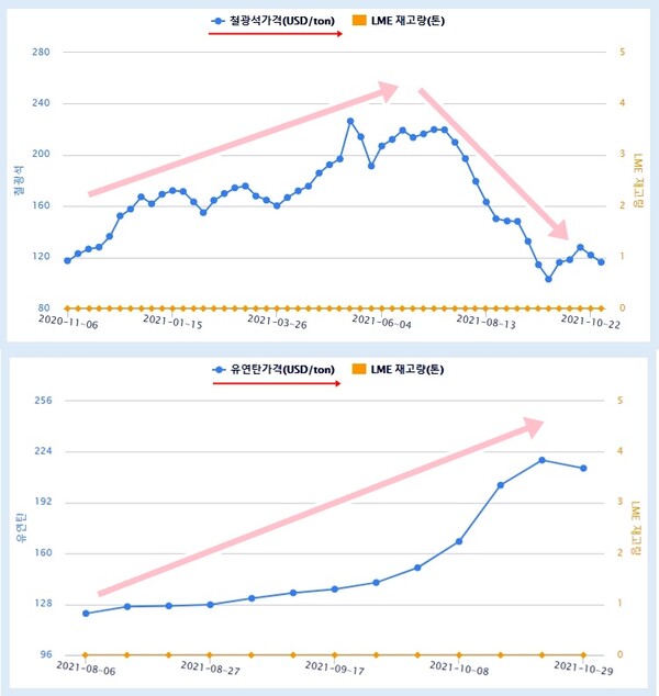 요소수 부족으로 인한 물류대란과는 정반대의 분위기인 곳이 철강업계다. 중국의 탄소배출 감축정책에 따른 철강생산 규제로 철강가격이 급등하면서 국내 철강업체가 슈퍼사이클을 맞게 됐다. 작년 11월 110달러대 수준이던 철광석 가격은 작년 말부터 상승해 올해 5월 14일 최고치인 226.46달러까지 치솟았다. 이후 이후 중국 철강 감산정책으로 내리 하락세를 보이다가 9월 102.94달러까지 내려온 뒤 10월 29일 현재 116.29달러 수준에 머물고 있다.