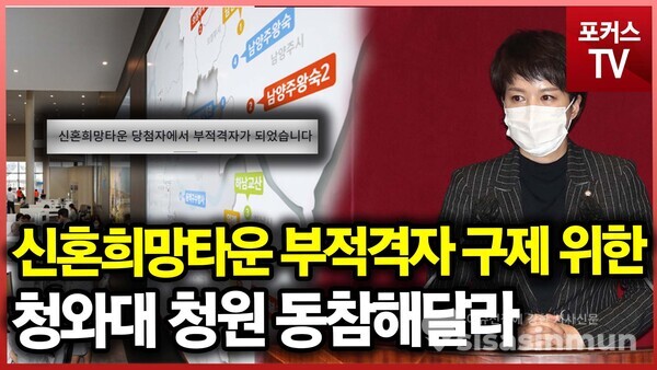 [시사신문 / 임희경 기자] 국민의힘 김은혜 의원이 페이스북을 통해 "신혼희망타운 부적격자 구제를 위한 청와대 청원 동참을 부탁한다"면서 "지난 국정감사에서 신혼희망타운이 신혼절망타운이 된 사연을 소개했다. 신혼희망타운은 나라에서 신혼부부들을 위해 공급하는 주택이고, 올해 기준으로 3억 300만 원 이하 자산 소유자만 청약을 넣을 수 있다"고 말했다. 그러면서 " 그런데 이 자산을 측정하는 방식이 비정상적이다. 소개해 드릴 분은 신혼희망타운 아파트에 당첨이 되었지만 억울하게 부적격자 꼬리표를 달게 되었다"고 말했다.