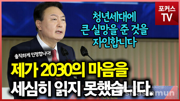 국민의힘 윤석열 대선후보가 페이스북을 통해 "저는 출마선언을 하며 청년들에게 공정한 세상을 만들겠다, 청년들의 목소리를 제대로 듣겠다고 약속했다"며 "제가 2030의 마음을 세심히 읽지 못했다"고 인정하며 "기성세대에 치우친 판단으로 청년세대에 큰 실망을 준 것을 자인한다"고 말했다.