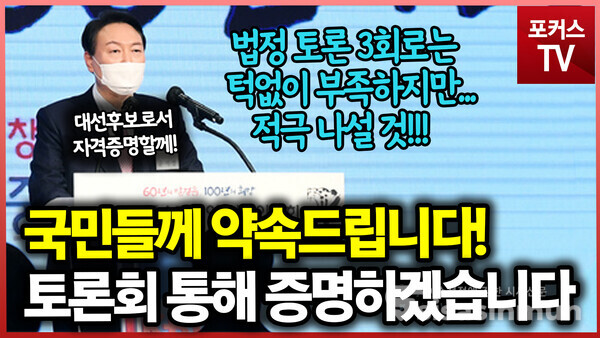 [시사신문 / 임희경 기자] 국민의힘 윤석열 대선후보가 페이스북을 통해 "국민들에게 약속드린다"면서 "토론회를 통해 대선후보의 자격을 증명하고, 새로운 대한민국을 위한 정책과 대안을 소상히 말씀드리도록 하겠다"고 말했다.