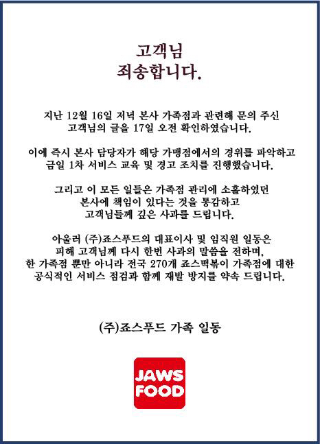 이에 죠스떡볶이 측은 “본사 담당자가 해당 가맹점에서의 경위를 파악하고 1차 서비스 교육 및 경고 조치를 진행했다”며, “가족점 관리에 소홀했던 본사에 책임이 있다는 것을 통감하고 고객님들께 깊은 사과를 드린다”고 전했다. 또 “전국 270개 죠스떡볶이 가족점에 대한 공식적인 서비스 점검과 함께 재발 방지를 약속드린다”고 사과문을 발표했다.