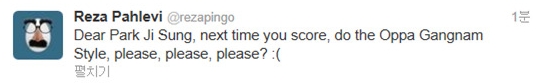 영국내에서도 싸이의 '강남스타일'의 인기를 증명하 듯 축구팬들은 박지성에서 강남스타일 골세레머리를 해달라는 요청이 빈번했고 박지성이 이에 대해 응답한 것.
