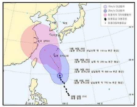 일본이 아닌 중국 쪽으로 선회하면서 오는 6~7일 제주도와 전라남도 일부가 직·간접적인 영향권에 들 것으로 보인다.