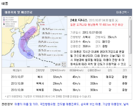 기상청 관계자는 "태풍 진로와 인접한 제주도와 남해안, 동해안은 초속 30m안팎의 강한 바람과 시간당 30㎜ 이상의 집중호우가 내릴 가능성이 있어 산사태, 축대붕괴, 침수 등의 피해가 없도록 철저히 대비해야한다"고 당부했다.