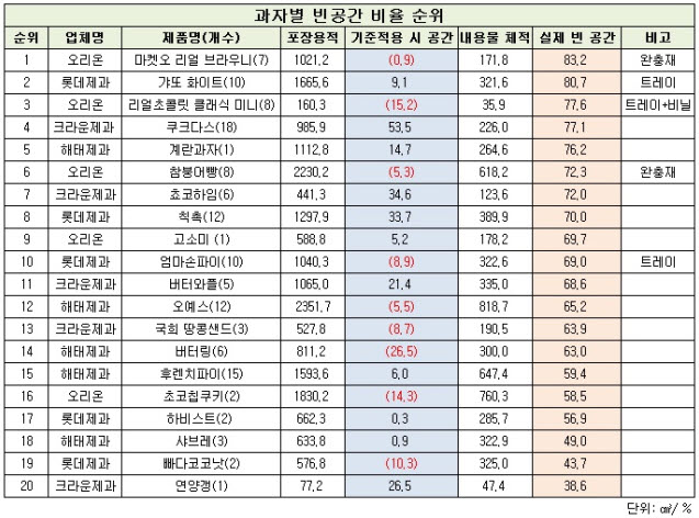 이밖에 오리온 ‘고소미’가 69.7%의 빈공간 비율이었고, 롯데 ‘엄마손파이’ 69%, 크라운제과 ‘버터와플’ 68.6%, 해태제과 ‘오예스’ 65.2%, 크라운제과 ‘국희땅콩샌드’ 63.9%, 해태제과 ‘버터링’ 63% 등의 순으로 조사됐다.