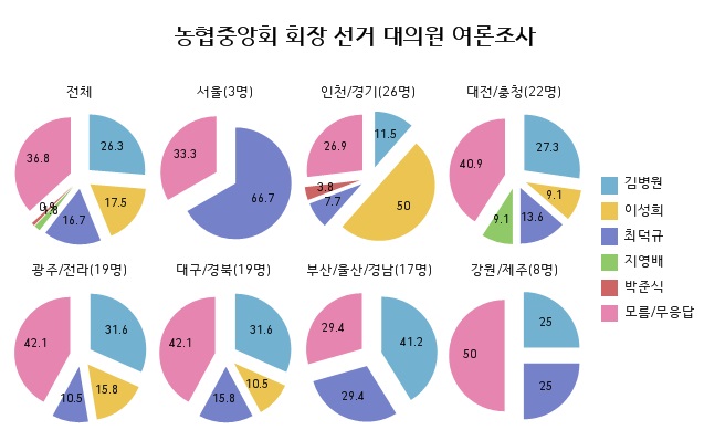 21일 여론조사 전문기관 디오피니언에 따르면 ‘농협중앙회 회장선거 대의원 여론조사’에서 ‘차기 농협중앙회 회장으로 누가 가장 적합하다고 생각하는지’를 묻는 질문에 응답자 114명의 26.3%가 김병원 전 대표를 선택했다. 전체 대의원 수는 290명이다.