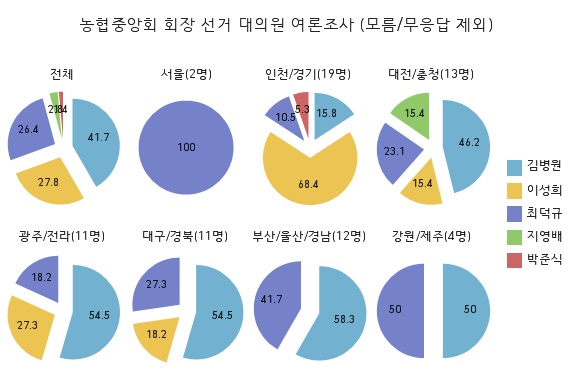 이번 여론조사는 지난 12월 12일 디오피니언이 예비 후보들의 차기 회장 적합도를 알아보기 위해 농협중앙회 대의원 290명을 대상으로 전화면접조사한 결과다. 전체 대의원 중 114명이 응답, 응답률 39.3%를 기록했다. 오차율은 ±7.2%p(95% 신뢰수준) 수준이지만 전수조사이기 때문에 오차율 산정의 의미는 적다는 평가다.