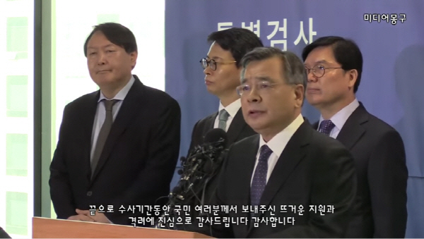 그는 이어 “실제 저희가 공소를 제기할 정도로 그렇게 할 정도로 수사가 됐던 사건은 한 2, 30% 정도밖에는 수사가 진행되지 않았던 것 같고, 그 정도만 기소가 된 거다. 시간도 좀 더 주어졌어야 했다. 또 제도적으로 특검법상 여러 가지 문제가 있어 더 수사를 못했던 부분도 있다”고 아쉬움을 표했다.