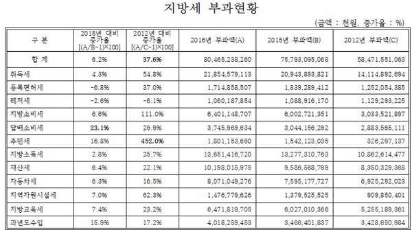특히 지난 2016년도 지방세 부과액은 80조 4,652억 원으로 2012년 지방세부과액이 58조 4,715억 원이었던 것에 비해 약 20조원이 증가해 4년 동안 37.6%가 인상되는 등 4년 동안의 연평균 인상율은 9.4% 상승했다.