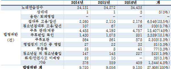 2일 국회 교문위 소속 유은혜 의원이 문화체육관광부로부터 제출받은 자료를 분석한 결과, 지난 3년간 노래방에서 벌어진 각종 법령위반의 적발건수가 2만 7천여 건에 달하는 것으로 나타났다.