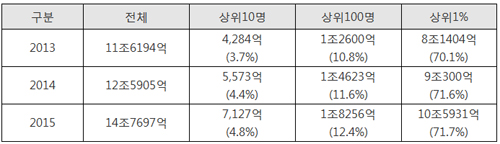 특히 배당소득이 가장 많은 상위10명의 배당 총액은 7,127억 원에 달했다. 주식부자 상위10명이 평균 713억 원을 받은 셈으로, 2014년(557억 원)보다 1인당 155억 원(28%)의 주식배당을 더 가져간 것이다.