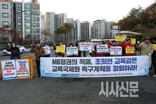 [시사신문 / 오훈 기자] 24일 오후 서울 종로구 서울시교육청 정문앞에서 전교조 서울지부는 교육국제화특구 사업 중단 촉구 집회를 가졌다.