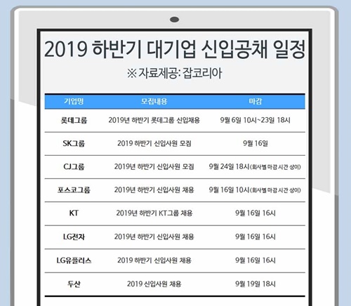 4일 잡코리아는 SK, CJ, 포스코 그룹 등 주요 대기업 하반기 신입공채 진행 일정을 정리해 발표했다.