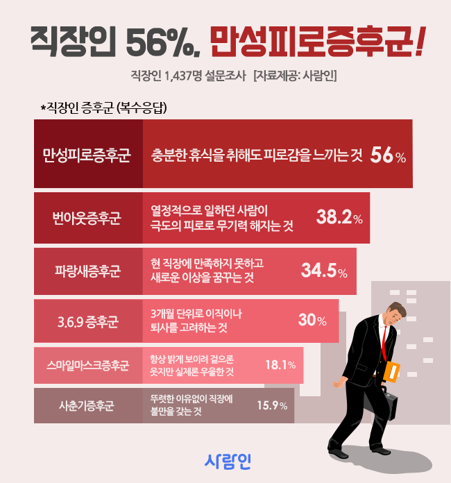[시사신문 / 임솔 기자] 구인구직 매칭플랫폼 사람인이 직장인 1,437명을 대상으로 ‘직장인 증후군’에 대해 조사한 결과, 직장인 절반 이상(56%, 복수응답)이 충분한 휴식을 취해도 피로감을 느끼는 ‘만성피로증후군’을 겪고 있는 것으로 조사됐다.