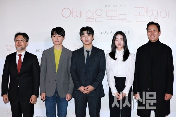 [시사신문 / 오훈 기자] 6일 오후 서울 용산구 CGV 용산아이파크몰에서 열린 영화 '어제 일은 모두 괜찮아' 언론시사회 및 기자간담회에서 이성한 감독, 배우 윤찬영, 손상연, 김진영, 김재철이 포토타임을 갖고 있다.