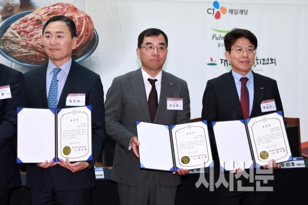[시사신문 / 오훈 기자] 임정배 대상 대표, 강신호 CJ제일제당 대표, 박남주 풀무원식품 대표가 25일 오후 서울 여의도 국회 의원회관 3층 로비에서 열린 황주홍 국회 농림축산식품해양수산위원회 위원장, 농림축산식품부, 동반성장위원회가 공동주최하는 맛있는 우리 김치와 함께 김치산업 상생협약식에서 표창장을 받고 기념촬영을 하고 있다.