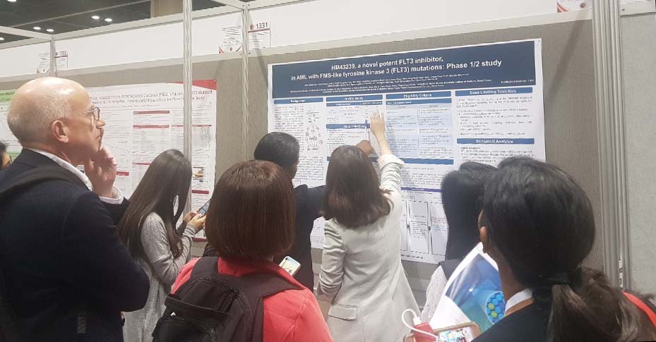한미약품은 이 행사에서 급성골수성백혈병(AML) 치료제로 개발중인 HM43239의 임상개발 현황에 대해 포스터로 발표했다. HM43239는 AML 환자에서 가장 빈번하게 발생하는 것으로 알려져 있는 FLT3 돌연변이(FLT3-ITD, FLT3-TKD, FLT3-ITD/TKD 변이를 포함)를 표적으로 하는 강력한 FLT3 억제제다.