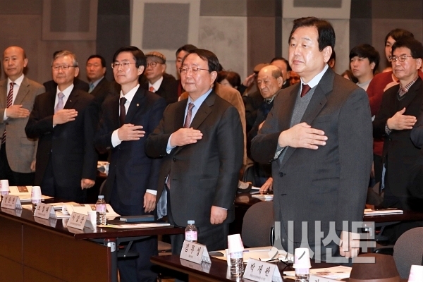 [시사신문 / 오훈 기자] 7일 오전 서울 중구 프레스센터 국제회의장에서 열린 범시민사회단체연합 주최 '2020 시민사회 신년회'에서 김무성 자유한국당 의원을 비롯해 이갑산 범시민사회단체연합 상임대표, 조경태 최고위원 등 내외빈들이 국민의례를 하고 있다.