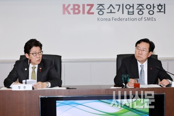 ▲ 조명래 환경부 장관과 김기문 중소기업중앙회 회장이 인사말을 하고 있다. [사진 /오훈 기자][시사신문 / 오훈 기자] 8일 오후 서울 영등포구 여의도 중소기업중앙회에서 열린 중소기업 규제 해소 간담회에서 조명래 환경부 장관과 김기문 중소기업중앙회 회장이 인사말을 하고 있다.
