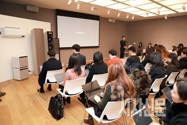 ▲ 이재환 삼성전자 생활가전사업부 상무가 신제품에 대해 설명하고 있다. [사진 / 오훈 기자][시사신문 / 오훈 기자] 삼성전자가 15일 오전 서울 서초구 삼성전자 서울 R&D캠퍼스에서 2020년형 ‘무풍에어컨’과 공기청정기 ‘무풍큐브’를 공개하는 기자간담회를 열었다.