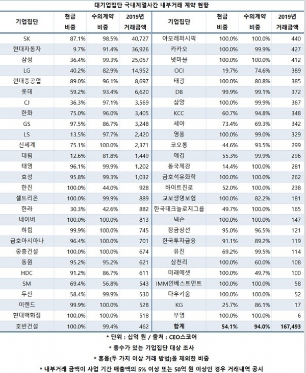 24일 CEO스코어에 따르면공정거래 위원회 지정 64개 대기업 집단 중 총수가 있는 55개그룹 2113개 계열사의 내부거래 행태를 조사했더니 작년 내부거래 금액은 총 167조4925억 원으로 이 가운데 157조3603억 원(94%)이 내부거래로 이뤄졌다고 밝혔다.