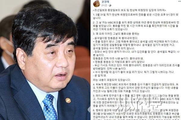 한 위원장은 이날 입장문을 통해 “통화시간은 MBC 보도가 나간 후 1시간 이상 지난 9시 9분”이라며 “통화내용도 MBC 보도와 관련 없는 것이었고 3월31일 MBC 보도 이전에 채널A 사건에 대해 미리 알고 있었다는 것은 사실이 아니다”라고 설명했다.